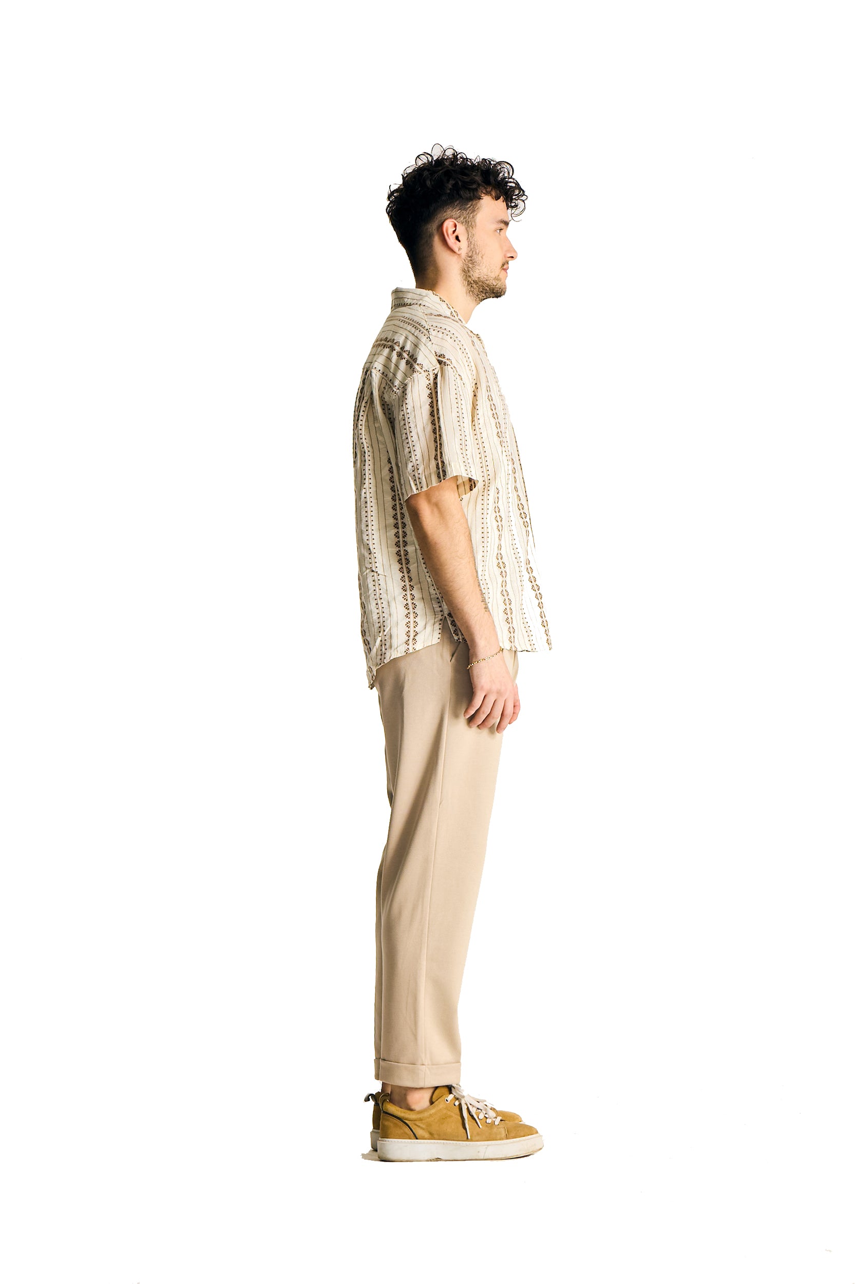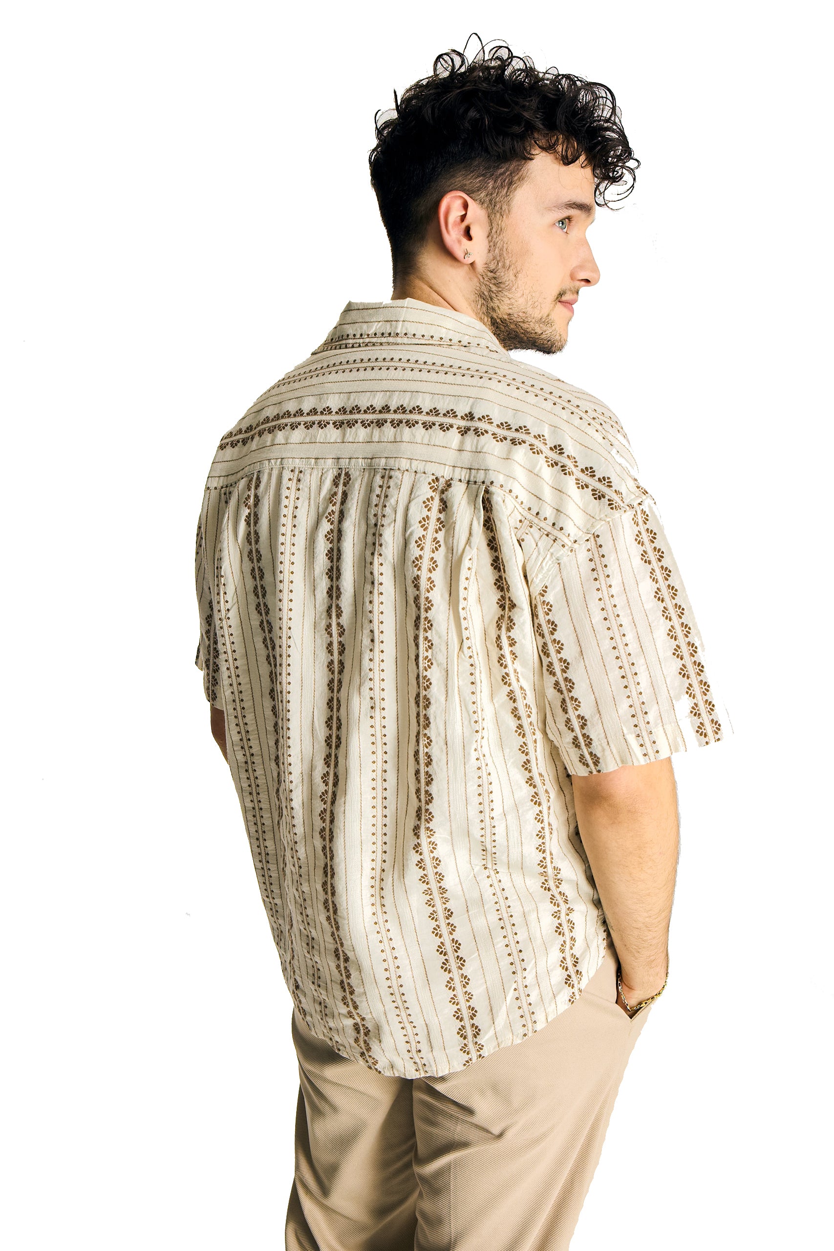Immerse yourself in the relaxed and stylish vibe of the Bohemian Brown Breeze Cotton Shirt. Made from 100% high-quality cotton, this short-sleeve shirt features intricate patterns that add a touch of bohemian charm to your wardrobe. Its breathable fabric and comfortable fit make it perfect for warm weather and casual outings.